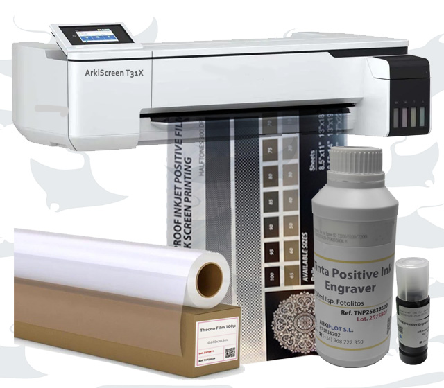 Pack para alta producción de fotolitos y cartelería, compuesto por plotter ArkiScreen T31X, una botella de tinta negra Engraver de 500ml, una botella de tinta negra Engraver Ecotank 70ml, 1 rollo de film para fotolitos 0,61x30,5m y portes a España peninsular incluidos. Ref: ARK.T3100X